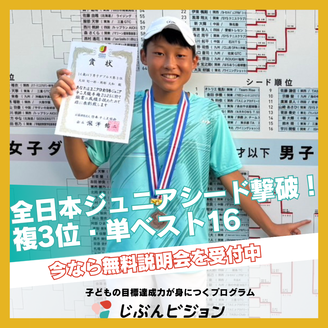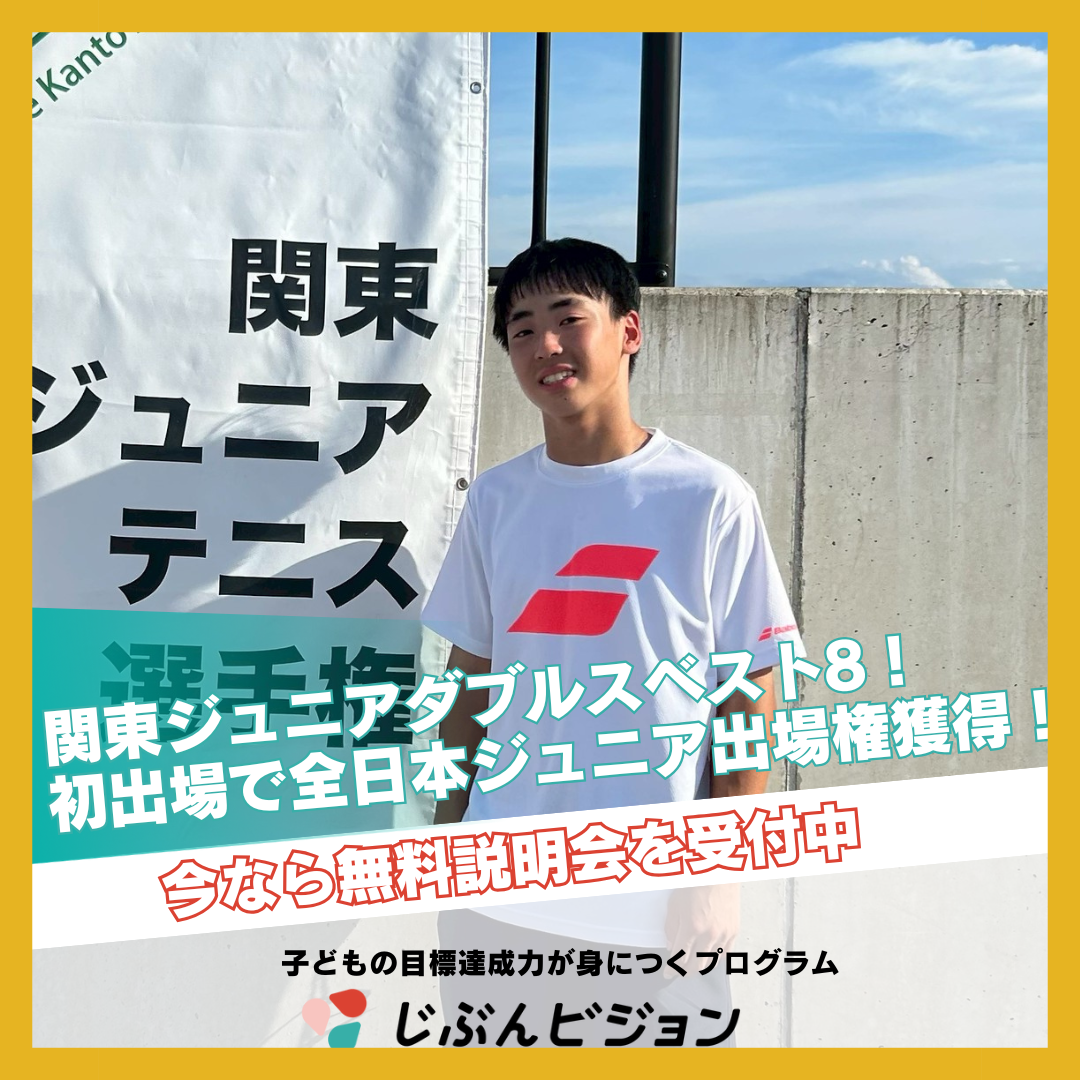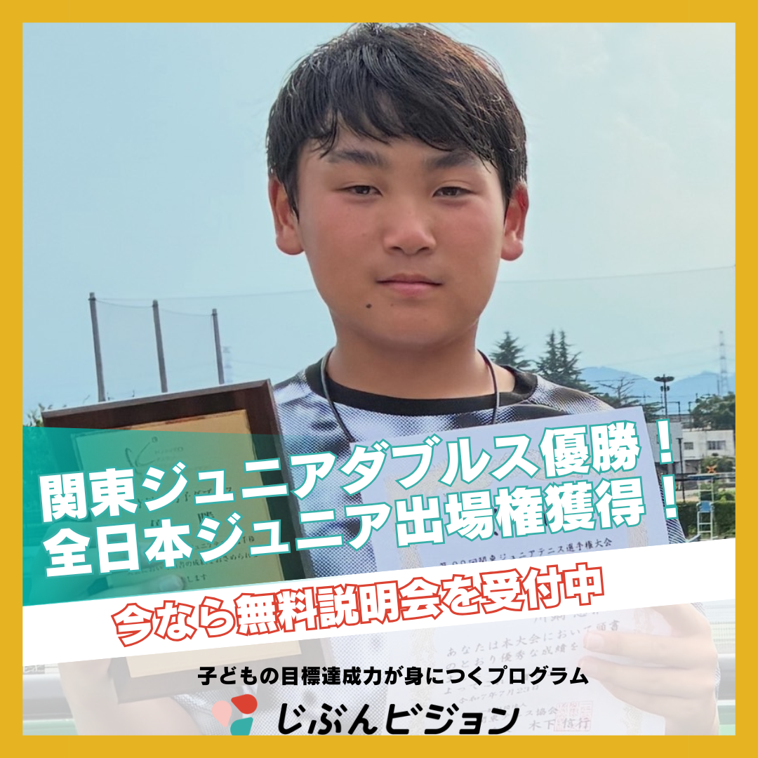 じぶんビジョンをはじめて2年で目標としていた関東ジュニアに出場することができました。そして、出場するだけでなく関東ジュニアベスト8、全日本ジュニアベスト16と結果を残すことができました。頑張れば結果が出るとは限らないけど、試合に向けて最善の準備をすることを意識できるようになったのが成長であり、結果が出た要因だと思います。